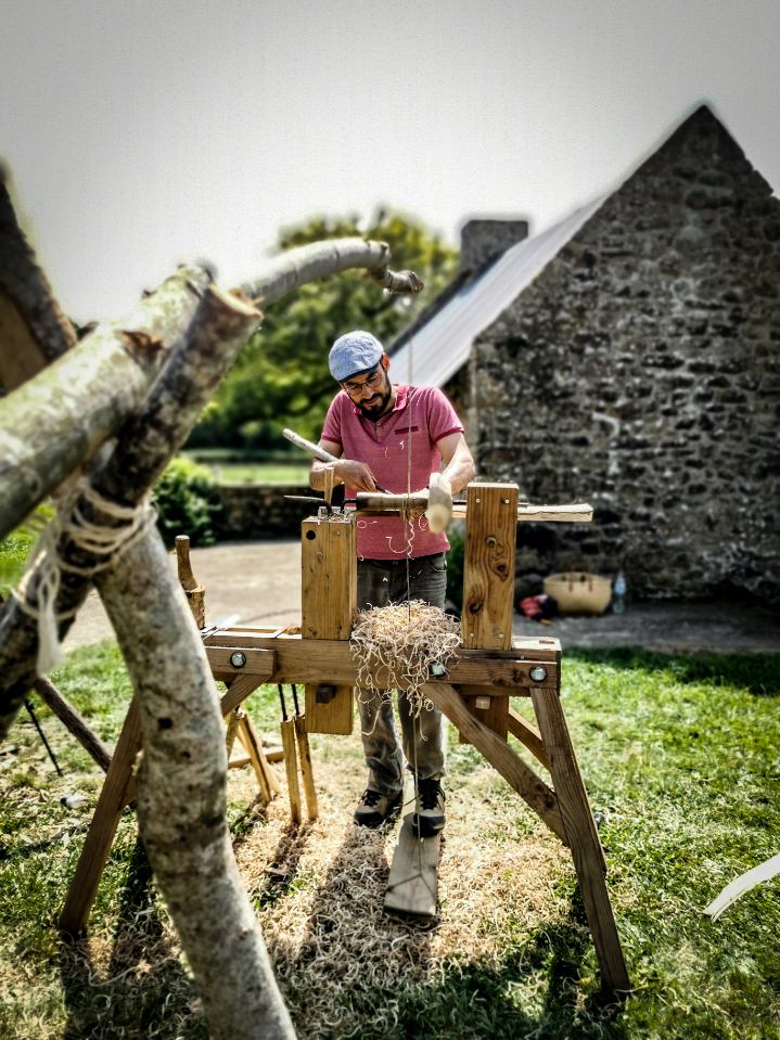 J’étais bon à l’école, alors… j’ai fait des études, d’ingénieur. D’une certaine manière, cette formation m’a à la fois donné une compréhension technique du monde qui nous entoure et elle a aussi annihilé une forme de créativité, de joie et de rapport au vivant. Dans la droite lignée de la réflexion cartésienne, elle a ancré une forme de hiérarchisation de tout et de rien, en classant les choses en bien ou en moins bien, plutôt que de constater qu’elles étaient juste différentes. Pour mieux comprendre ce propos, je vous invite à lire Baptiste Morizot « Manières d’être vivants ». Ensuite, l’ingénieur a constaté que les solutions techniques existent (déreglement climatique, pollutions, perte de biodiversité, etc.) et que le blocage se situe donc ailleurs. J’ai alors étudié 3 ans la Somato-psychopédagogie et un semestre de psycho-sociologie. En parallèle, j’ai travaillé en sous-traitant pour l’UE dans les pays ACP et j’ai co-fondé l’écovillage demain en main dans le Morbihan. Maintenant, je crois que l’on ne défend que ce qui nous touche, alors je propose à des personnes de venir explorer avec moi la simple complexité du travail manuel du bois, la magie des arbres, les motifs toujours changeants d’une bûche, la curiosité d’un rouge gorge pour nos copeaux, le son des vagues qui nous donnent parfois le tempo des coups de hache.