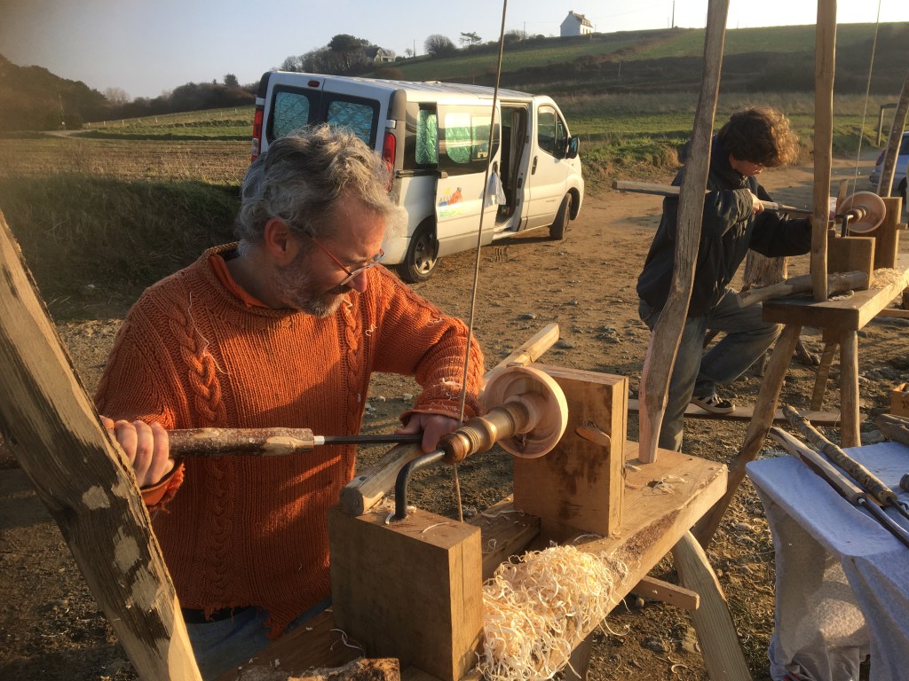 On me dit souvent « bon courage » quand on me voit tourner un bol à la force de ma jambe. Pourtant, c’est lorsque je me trouvais à Paris dans un bureau du centre ville, 1 fenêtre pour 5, la cravate serrant le cou que j’en aurait eu besoin. Certes, le salaire n’est pas le même, mais mon quotidien est tellement plus riche! La liberté qu’offrent les outils manuels, qui ne nécessitent ni électricité, ni pétrole, ni wifi, ni bluetooth, ni 5G est incroyable. Pas d’obsolescence programmée sur une hachette. Bien entretenue, elle fera plusieurs générations. Même tombée au sol, un coup d’affûtage et c’est reparti. Et quand je parle de liberté je parle aussi de liberté spatiale,sonore, respiratoire, etc.. Pour exemple, quelques photo d’un stage de janvier, une belle journée, délocalisée à la plage du coin, simplement parce qu’avec ce papa et son fils de 14 ans, on en avait envie.